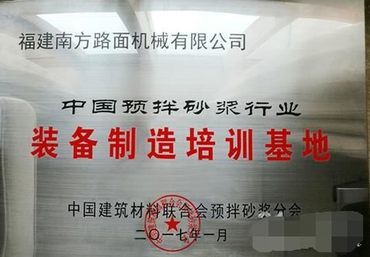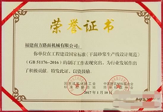 2017年1月10日,在2017'首屆中國國際預(yù)拌砂漿裝備技術(shù)研討會暨預(yù)拌砂漿綠色生產(chǎn)裝備及機械化施工技術(shù)峰會上,福建南方路面機械有限公司被中國建材聯(lián)合會預(yù)拌砂漿分會授予“中國預(yù)拌砂漿行業(yè)裝備制造培訓基地”;同時,因在國家標準GB51176-2016《干混砂漿生產(chǎn)線設(shè)計規(guī)范》編制工作中的特殊貢獻,被授予“特別貢獻單位”。