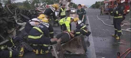 由于駕駛室變形嚴重,救援難度較大,為全力救出被困者,消防官兵首先利用擴張器從左側(cè)車門擴張,而后用撐頂桿對壓住被困者的變形車窗中間部位一點一點進行擴張,并小心翼翼地挪動被困者的身體,發(fā)現(xiàn)車門位置已經(jīng)變形卡主被困人員,現(xiàn)場指揮員果斷命令用無齒鋸對車門部位切割并用戰(zhàn)斗服蓋住被困人員防止燙傷,水槍一直保持充實水柱狀態(tài)。
