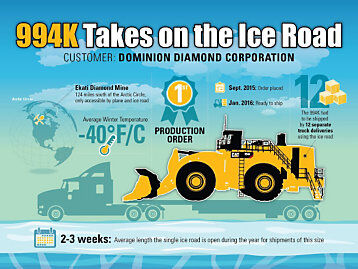 一旦機器安全到達客戶的施工現(xiàn)場,真正的樂趣就開始了。Carlos與卡特彼勒代理商芬寧加拿大分部的四名機械師合作安裝了這臺長18米的設備。Carlos非常喜歡客戶定期來到994K的安裝現(xiàn)場,客戶對在施工現(xiàn)場使用這種新型Cat裝載機的興奮勁也讓他很開心。“看到這么大的設備Dominion Diamond很興奮,他們迫不及待地希望把它派上用場。”