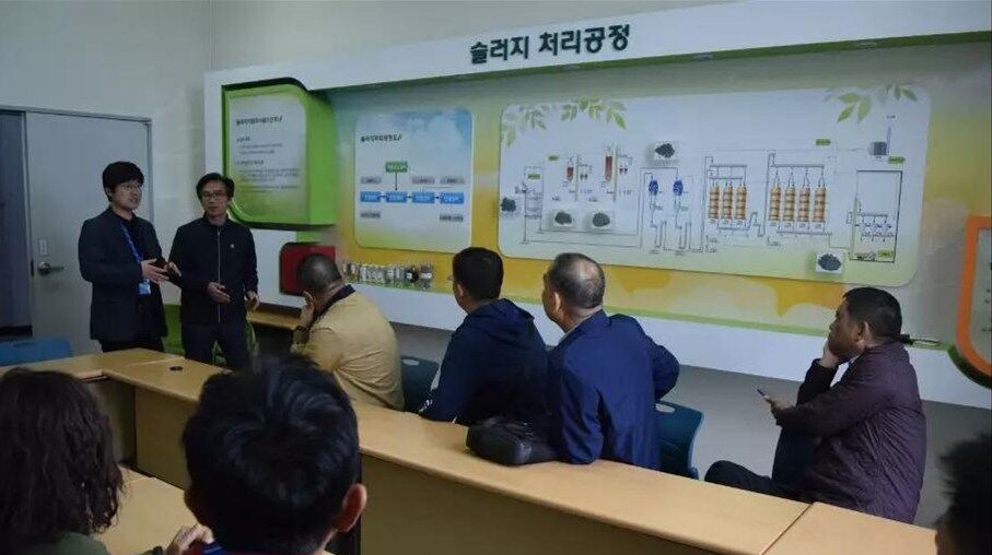 10日下午考察團一行到達韓國最大的垃圾填埋廠,首先參觀生活食品垃圾運輸車輛沖洗設備,此套設備由兩組車輛沖洗線構成,每條線長度為50米,當車輛駛入至感應區(qū)設備自動啟動對車輛全方位立體式沖洗,沖洗中掉落的異物經特制排泥裝置送至中央皮帶輸送機。車輛完成沖洗后駛出前對車身噴淋消毒去異味藥劑,最后烘干后離開。每日完成一千車次的清洗消毒工作。