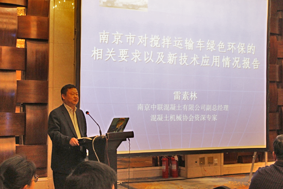 南京中聯(lián)混凝土有限公司副總經(jīng)理、混凝土機械協(xié)會資深專家雷素林先生作了《南京市對攪拌運輸車綠色環(huán)保的相關(guān)要求以及新技術(shù)應(yīng)用情況報告》的主題演講,從南京環(huán)保和攪拌車治理過程中所遇到的問題提出了攪拌車在綠色環(huán)保和新技術(shù)應(yīng)用方面的以下幾點建議: