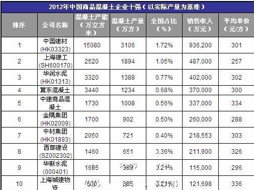 2012中國商品混凝土企業(yè)十強(以實際產(chǎn)量為基準)