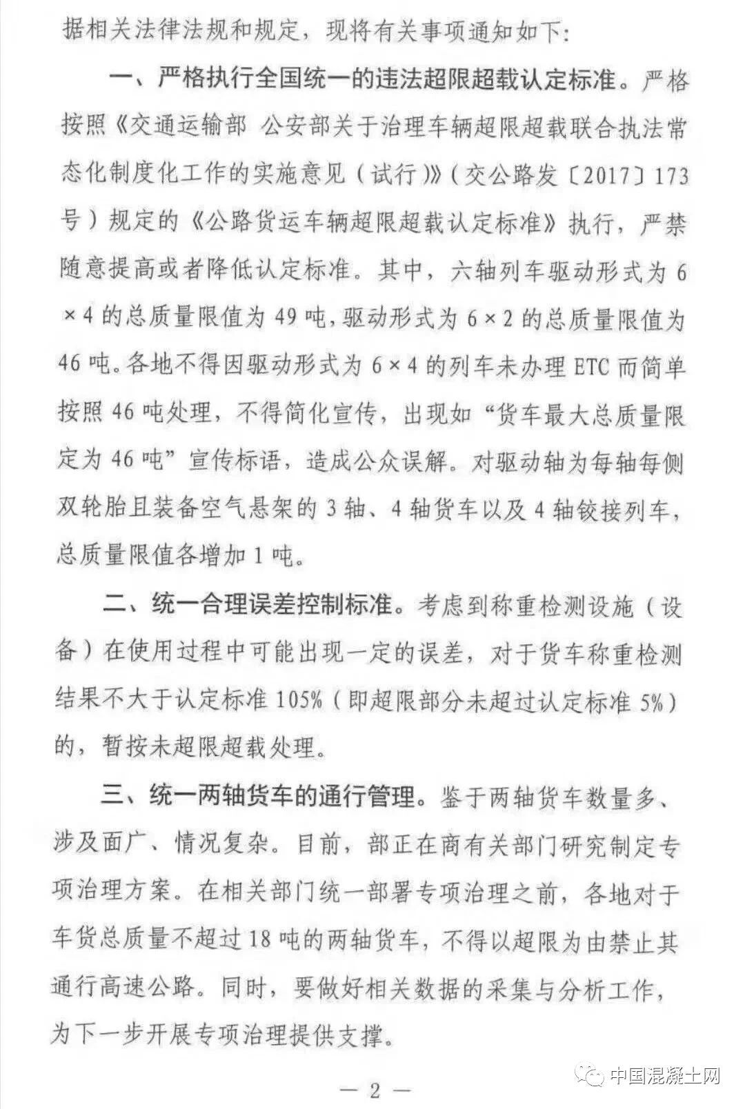 一、嚴(yán)格執(zhí)行全國統(tǒng)一的違法超限超載認(rèn)定標(biāo)準(zhǔn)。嚴(yán)格按照《交通運(yùn)輸部 公安部關(guān)于治理車輛超限超開車聯(lián)合執(zhí)法常態(tài)化制度化工作的實施意見 (試行)》(交公路發(fā)【2017】173號)規(guī)定的《公路貨運(yùn)車輛超限超載認(rèn)定標(biāo)準(zhǔn)》執(zhí)行,嚴(yán)禁隨意提高或者降低認(rèn)定標(biāo)準(zhǔn)。其中,六軸列車驅(qū)動形式為6×4的總質(zhì)量限值為49噸,驅(qū)動形式為6×2的總質(zhì)量限值為46噸。各地不得因驅(qū)動形式為6×4人列車未辦理ETC而簡單按照46噸處理,不得簡化宣傳,出現(xiàn)如“貨車最大總質(zhì)量限定為46噸”宣傳標(biāo)語,造成公眾誤解。對驅(qū)動軸為每軸每則雙輪胎且裝備空氣懸架的3軸、車軸貨車以及4軸鉸接列車總質(zhì)量限值各增加1噸。二、統(tǒng)一合理誤差控制標(biāo)準(zhǔn)。考慮到稱重檢測設(shè)施(設(shè)備)在使用過程中可能出現(xiàn)一定的誤差,對于貨車稱重檢測結(jié)果不大于認(rèn)定標(biāo)準(zhǔn)105%(即超限部分未直如過認(rèn)定標(biāo)準(zhǔn)的5%)的,暫按未超限超載處理。鑒于兩軸貨車數(shù)量多、涉及面廣、情況復(fù)雜。目前,部正在商有關(guān)部門研究制定專項治理方案。在相關(guān)部門統(tǒng)一部署專項治理之前,各地對于車貨總質(zhì)量不超過18噸的兩軸貨車,不得以超限為由禁止其通行高速公路。同時,要做好相關(guān)數(shù)據(jù)的采集與分析工作,為下一步開展專項治理提供支撐。《交通運(yùn)輸部辦公室廳關(guān)于進(jìn)一步規(guī)范高速公路入口治超工作的通知》(交辦公路【2019】29號)中所提的“貨車必檢,超限禁入”中,“超限”特指車貨總質(zhì)量違法超限行為;對已辦理《超限運(yùn)輸車輛通行證》的合法大件運(yùn)輸致車輛,應(yīng)允許其通行高速公路,并做好相關(guān)服務(wù)保障工作。根據(jù)《交通運(yùn)輸部 公安部關(guān)于治理車輛超限超載聯(lián)合執(zhí)法常態(tài)化制度化工作的實施意見(試行)》(交公路發(fā)【2017】173號)部署,目前重點對車貨總質(zhì)量進(jìn)行稱重檢測。對于車貨外廓尺寸超限行為,將按照國家有關(guān)部門的統(tǒng)一部署,分階段、有步驟推進(jìn);在部署工作開展前,高速公路入口暫不對車貨外廓尺寸進(jìn)行檢測。對車輛運(yùn)輸超限標(biāo)準(zhǔn)的認(rèn)定,按照《交通運(yùn)輸 部辦公室廳 公安部辦公室廳 工業(yè)和信息化部辦公室廳關(guān)于深入推進(jìn)車輛運(yùn)輸車治理工作的通知》(交辦運(yùn)【2018】702號)有關(guān)要求執(zhí)行,對于合規(guī)車輛運(yùn)輸車,凡裝載符合要求的,即平頭鉸接列車裝載6輛及以下,長頭鉸接列車裝載7輛及以下,中置軸車輛運(yùn)輸車裝載9輛及以下,且裝載長度、寬度未超過車輛運(yùn)輸車外廓尺寸限值的,暫不對車輛高度進(jìn)行檢測。組織公路執(zhí)法機(jī)構(gòu)和高速公路經(jīng)營管理單位,通過媒體宣傳、懸掛標(biāo)語和橫幅、散發(fā)傳單等多種方式,大力宣傳高速公路入口稱重檢測政策,重點宣傳此項工作對保護(hù) 人民群眾生命財產(chǎn)安全的重大意義 ,宣傳解讀治超政策、治超標(biāo)準(zhǔn),爭取廣大貨運(yùn)企業(yè)和貨車車主了解政策、熟悉政策,支持政策實施。要利用稱重檢測環(huán)節(jié),逐車提醒、提示貨車司機(jī),盡快安裝ETC,充分享受便捷通行、交費(fèi)打折、加油優(yōu)惠、車便利等各種政策紅利,促進(jìn)物流提質(zhì)增效。未盡事宜,按照《超限運(yùn)輸車輛行駛公路管理規(guī)定》和173號文件等有關(guān)規(guī)定執(zhí)行。各地執(zhí)行過程中出現(xiàn)的要及時報部。全國物流標(biāo)準(zhǔn)非常混亂,地方標(biāo)準(zhǔn)與國家標(biāo)準(zhǔn)經(jīng)?!按蚣堋?,導(dǎo)致全國物流司機(jī)苦不堪言,而此次交通廳像各省運(yùn)輸廳發(fā)布特急文件通知,劍指就是統(tǒng)一運(yùn)輸車輛載重的標(biāo)準(zhǔn),令運(yùn)輸行業(yè)向制度化,規(guī)范化過渡。同時從根源上徹底清除“亂收費(fèi)”現(xiàn)象,并發(fā)布問題反映電話:部科學(xué)研究院:陳宓 18600797358部規(guī)劃院:張新虎 13811681357部路網(wǎng)中心:李友良 15522515653