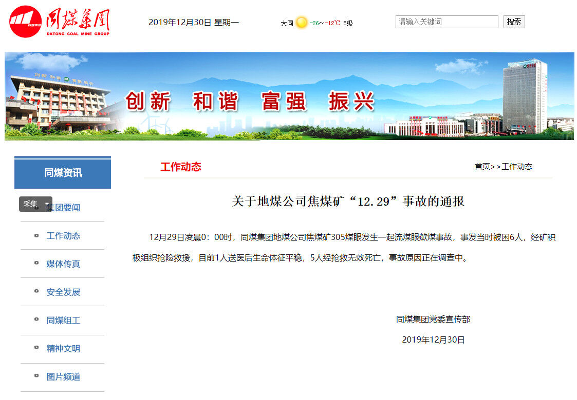 聲威水泥事故受困人員與死神擦肩而過,可謂有驚無險。可是同煤集團(tuán)受困人員就沒有那么幸運(yùn)了,12月29日凌晨0時,同煤集團(tuán)地煤公司焦煤礦305煤眼發(fā)生一起流煤眼歘煤事故,事發(fā)當(dāng)時6人被困,經(jīng)積極組織搶險救援,目前1人送醫(yī)后生命體征平穩(wěn),5人經(jīng)搶救無效死亡,事故原因正在調(diào)查中。