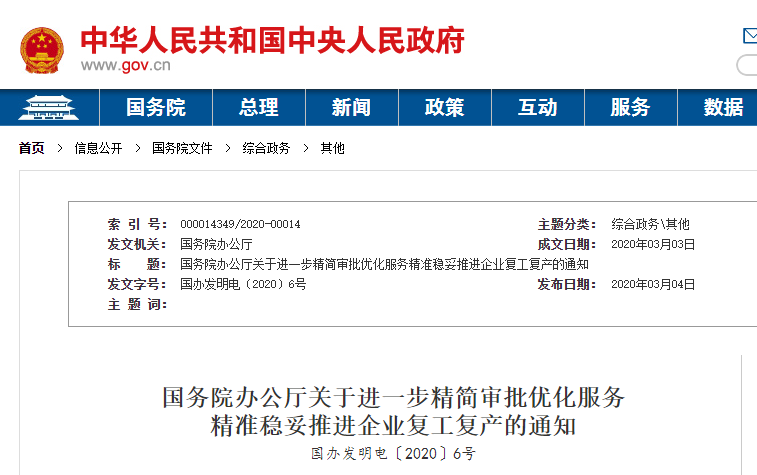 為貫徹落實黨中央關(guān)于統(tǒng)籌推進疫情防控和經(jīng)濟社會發(fā)展工作的決策部署,深化“放管服”改革,取消不合理審批,規(guī)范審批事項和行為,提供便利服務(wù),精準穩(wěn)妥推進企業(yè)復(fù)工復(fù)產(chǎn),現(xiàn)就除湖北省、北京市以外地區(qū)復(fù)工復(fù)產(chǎn)有關(guān)事項通知如下: