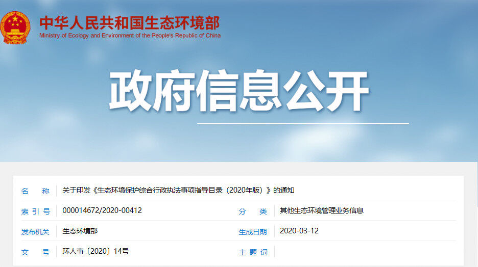 近日,生態(tài)環(huán)境部發(fā)布了關(guān)于印發(fā)《生態(tài)環(huán)境保護(hù)綜合行政執(zhí)法事項(xiàng)指導(dǎo)目錄(2020年版)》(以下簡稱“《指導(dǎo)目錄》”)的通知,稱根據(jù)深化黨和國家機(jī)構(gòu)改革有關(guān)安排部署,為貫徹落實(shí)《國務(wù)院辦公廳關(guān)于生態(tài)環(huán)境保護(hù)綜合行政執(zhí)法有關(guān)事項(xiàng)的通知》(國辦函〔2020〕18號)要求,扎實(shí)推進(jìn)生態(tài)環(huán)境保護(hù)綜合行政執(zhí)法改革,現(xiàn)印發(fā)《生態(tài)環(huán)境保護(hù)綜合行政執(zhí)法事項(xiàng)指導(dǎo)目錄(2020年版)》及說明。