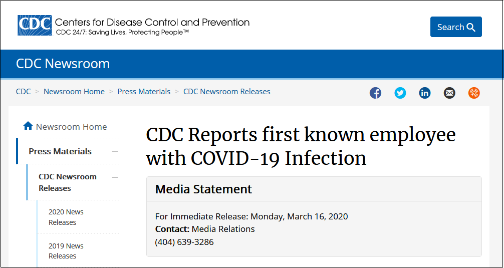 美國疾控中心出現(xiàn)首例員工感染新冠病毒病例