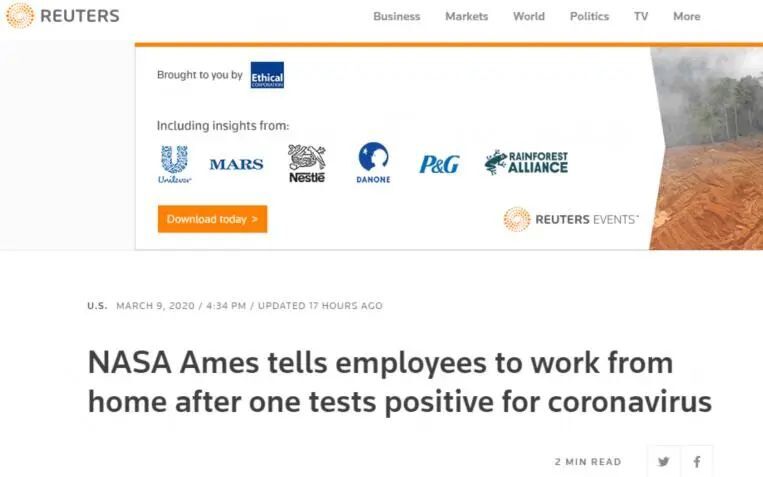據(jù)路透社3月9日報(bào)道,美國國家航空航天局(NASA)位于加利福尼亞州的艾姆斯研究中心3月8日發(fā)表聲明稱,該中心一員工新冠病毒檢測呈陽性。出于謹(jǐn)慎考慮,該中心要求其他員工在家工作,直到另行通知。