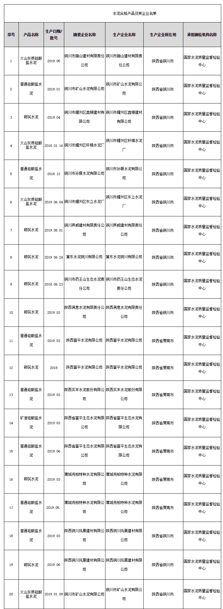 2020年3月31日,陜西省市場(chǎng)監(jiān)督管理局網(wǎng)站公布水泥產(chǎn)品質(zhì)量監(jiān)督抽查結(jié)果。此次水泥產(chǎn)品在銅川、渭南等地的生產(chǎn)領(lǐng)域中抽取,共抽查生產(chǎn)企業(yè)15家,抽取樣品20批次,經(jīng)檢驗(yàn),合格樣品20批次。