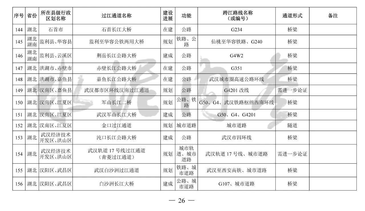 湖北?。?4座):巴東長江公路二橋、興山至長陽高速公路過江通道、宜昌東艷路過江通道、宜都紅花套過江通道、枝江百里洲長江大橋、李埠長江公鐵大橋、觀音寺長江大橋、武漢都市區(qū)環(huán)線漢南過江通道、軍山長江二橋、武漢軌道17號線過江通道(青菱過江通道)、武漢白沙洲過江通道、武漢軌道12號線白沙洲過江通道、武漢軌道11號線三期漢陽段過江通道、武漢軌道13號線過江通道(小東門過江通道)、二七路過江通道、武漢軌道10號線二七過江通道、武漢軌道12號線丹水池過江通道、堤角過江通道、武漢軌道20號線過江通道、武漢軌道25號線過江通道(長江新城過江通道)、武漢軌道新港線陽邏過江通道、光谷過江通道、新港高速雙柳長江大橋、鄂黃第二過江通道鄂湘界(1座):監(jiān)利至華容公鐵兩用大橋