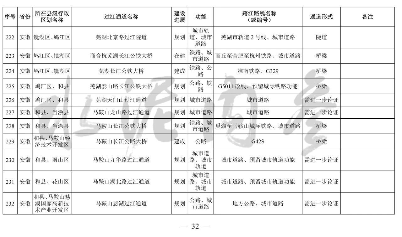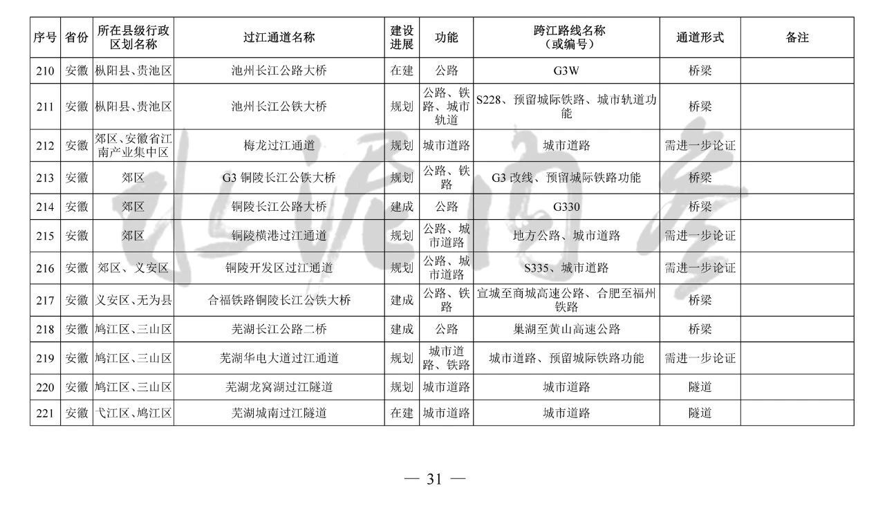 安徽?。?座):望江長江公鐵大橋、安慶??陂L江公路大橋、池州長江公鐵大橋、G3銅陵長江公鐵大橋、銅陵開發(fā)區(qū)過江通道、蕪湖北京路過江隧道、蕪湖泰山路長江公鐵大橋、馬鞍山長江公鐵大橋、馬鞍山九華路過江通道