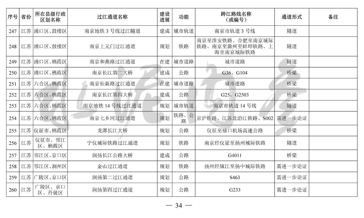 江蘇?。?3座):錦文路過江通道、南京地鐵4號線過江通道、南京市域快速軌道過江通道、南京上元門過江通道、南京七鄉(xiāng)河過江通道、龍?zhí)堕L江大橋、寧儀城際鐵路過江通道、潤揚第二過江通道、江陰第二過江通道、江陰第三過江通道、張皋過江通道、蘇通第二過江通道、海太過江通道