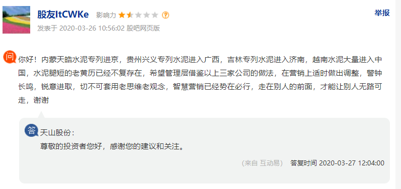 同期有投資者在上市平臺(tái)向天山股份董秘提問并建議說:內(nèi)蒙天皓水泥專列進(jìn)京,貴州興義專列水泥進(jìn)入廣西,吉林專列水泥進(jìn)入濟(jì)南,越南水泥大量進(jìn)入中國,水泥腿短的老黃歷已經(jīng)不復(fù)存在,希望管理層借鑒以上三家公司的做法,在營銷上適時(shí)做出調(diào)整,警鐘長鳴,銳意進(jìn)取,切不可套用老思維老觀念,智慧營銷已經(jīng)勢(shì)在必行,走在別人的前面,才能讓別人無路可走。