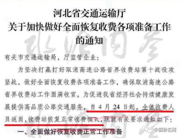 據(jù)中國砂石協(xié)會和中國砂石網(wǎng)了解,日前,河北省交通運輸廳發(fā)布《關(guān)于加快做好全面恢復(fù)收費各項準(zhǔn)備工作的通知》稱為堅決打贏打好取消高速公路省界收費站第十戰(zhàn)役攻堅戰(zhàn),做好全面恢復(fù)收費各項準(zhǔn)備工作,確保取消高速公路省界收費站工作圓滿收官,為促進(jìn)全省經(jīng)濟(jì)社會持續(xù)健康發(fā)展提供高品質(zhì)公路交通服務(wù),自4月24日起,全體收費人員返崗,收費站恢復(fù)正常收費模式。