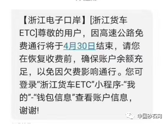 近日,很多浙江ETC用戶收到同樣一條短信,短信的內(nèi)容大致是:因高速公路免費通行將于4月30日結(jié)束,請大家保持賬戶余額充足。