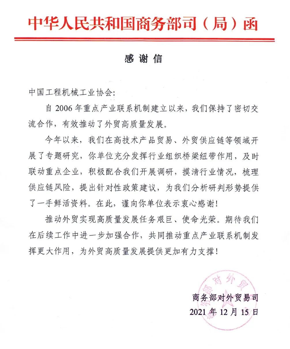 近日,商務(wù)部對外貿(mào)易司致函中國工程機械工業(yè)協(xié)會,就協(xié)會今年以來,積極配合商務(wù)部對外貿(mào)易司在高技術(shù)產(chǎn)品貿(mào)易、外貿(mào)供應(yīng)鏈等領(lǐng)域開展了專題研究,收集、整理了大量的行業(yè)外貿(mào)進出口情況,受到了高度的肯定。并指出,協(xié)會充分發(fā)揮行業(yè)組織橋梁紐帶作用,及時聯(lián)動重點企業(yè),積極配合商務(wù)部對外貿(mào)易司開展調(diào)研,摸清行業(yè)情況,梳理供應(yīng)鏈風(fēng)險,提出針對性政策建議,為商務(wù)部對外貿(mào)易司分析研判形勢提供了一手鮮活資料。在此,謹(jǐn)向協(xié)會表示衷心感謝!