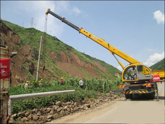 筆者連線徐工起重機(jī)事業(yè)部駐云南辦事處卞泳主任,他介紹了相關(guān)情況。8月7日上午,魯?shù)榭h城通往震中龍頭山鎮(zhèn)的道路經(jīng)過兩日的搶修和交通管制已基本暢通,武警交通部隊(duì)決定允許放行小型汽車起重機(jī)。指揮部要求南方電網(wǎng)公司迅速完成龍頭山鎮(zhèn)幾處電線桿及變壓設(shè)備的安裝。南方電網(wǎng)公司考慮道路情況惡劣,決定征用一直等候在交通管制境界線之外的一臺(tái)徐工QY12B.5汽車起重機(jī),徐工12噸起重機(jī)迅速到達(dá)現(xiàn)場投入搶修。