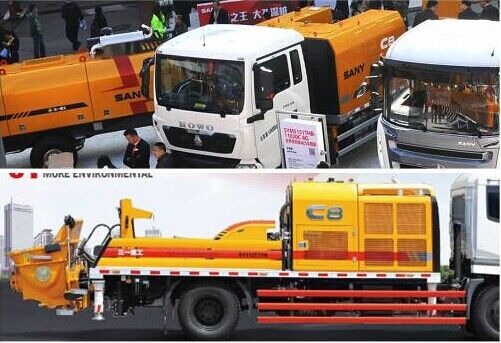 三一HOWO國Ⅳ排放標準單動力車載泵(無上裝動力)是bauma展覽會上展出的唯一一臺車載泵。配置單一動力和進口分動箱,從而節(jié)約了一臺上裝泵送柴油發(fā)動機,是該車的最大亮點。該車載泵柴油機功率為206kW,6.87L排量,配置400L大油箱,混凝土理論輸送壓力10/20MPa,理論輸送量115/60m3/h。