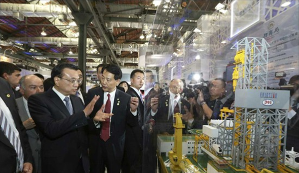 當(dāng)?shù)貢r(shí)間20日,李克強(qiáng)在里約熱內(nèi)盧州州長(zhǎng)佩藏和巴西外長(zhǎng)維埃拉的陪同下來到里約民港碼頭,參觀正在這里舉辦的中國(guó)裝備制造業(yè)展覽,并為展覽開幕剪彩。展覽包括鐵路及軌道交通、電力、通信、金融等10個(gè)板塊,代表國(guó)內(nèi)裝備制造業(yè)最高水平的30家中國(guó)企業(yè)參展。