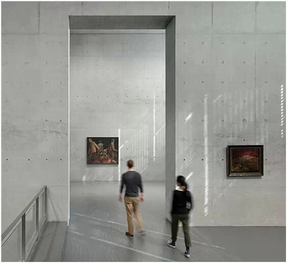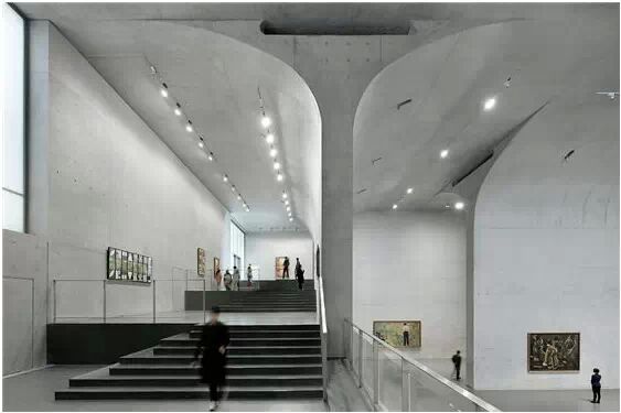 在“傘拱”結(jié)構(gòu)的空腔里,地面以上的“傘拱”覆蓋空間,墻體和天花均為清水混凝土的表面,它們的幾何分界位置也變得模糊。這樣的結(jié)構(gòu)性空間,在形態(tài)上不僅對(duì)人的身體形成庇護(hù)感,亦與保留的江邊碼頭的煤料斗產(chǎn)生視覺呼應(yīng)。建筑的內(nèi)部空間也得以呈現(xiàn)一種原始的野性魅力,而有著大小調(diào)節(jié)的空間尺度以及留有模板拼縫和螺栓孔的清水混凝土表面又會(huì)帶來一種現(xiàn)實(shí)感。這種“直白”式的結(jié)構(gòu)、材料、空間所形成的直接性與樸素性,加上大尺度出挑所產(chǎn)生的力量感或輕盈感,使整個(gè)建筑與原有場(chǎng)地的工業(yè)特質(zhì)間取得一種時(shí)間與空間的接續(xù)關(guān)系。地面以上的清水混凝土“傘拱”下的流動(dòng)展覽空間和地下一層傳統(tǒng)“白盒子”式的展覽空間由一個(gè)呈螺旋回轉(zhuǎn)、層層跌落的階梯空間聯(lián)接,既原始又現(xiàn)實(shí)的空間和古代、近代、現(xiàn)代直到當(dāng)代藝術(shù)的展覽陳列,這種并置的張力,呈現(xiàn)出一種具有時(shí)間性的展覽空間。