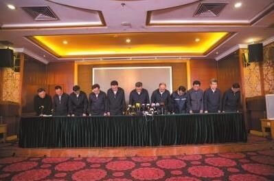 25日,深圳市委書記馬興瑞(左六)和市長許勤(左七)等深圳市和光明新區(qū)領導在發(fā)布會上鞠躬道歉。