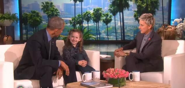 在本次節(jié)目中,主持人狄珍妮(Ellen DeGeneres)首先歡迎6歲的「總統(tǒng)專家」?jié)h斯利(Macey Hensley)出場。這名可愛的小女孩揮著手走出來,先后擁抱奧巴馬和狄珍妮。