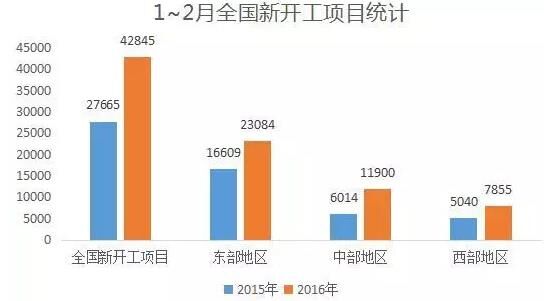 今年1~2月,全國新開工項(xiàng)目42845個,比去年增加15180個。其中,東部地區(qū)新開工項(xiàng)目23084個,增加6475個;中部地區(qū)新開工項(xiàng)目11900個,增加5886個;西部地區(qū)新開工項(xiàng)目7855個,增加2815個。