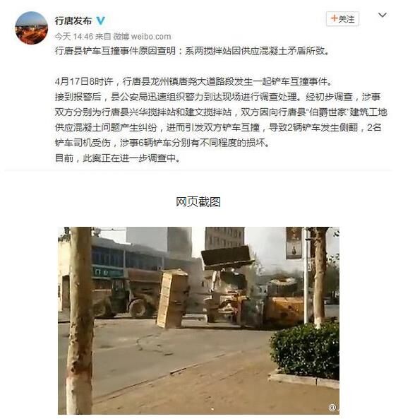 17日8時(shí)許,行唐縣發(fā)生鏟車互撞事件。經(jīng)警方初步調(diào)查,涉事雙方為行唐縣兩攪拌站,因向某建筑工地供應(yīng)混凝土問題產(chǎn)生糾紛,進(jìn)而沖突。致2輛鏟車發(fā)生側(cè)翻,2名鏟車司機(jī)受傷,涉事6輛鏟車分別有不同程度的損壞。該案還在進(jìn)一步調(diào)查中。