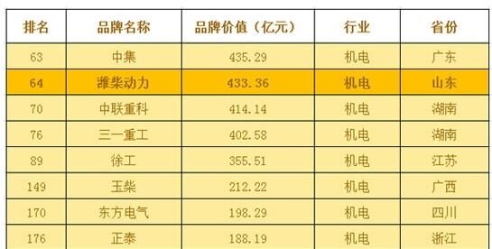2016年5月12日,中國品牌價值500強評審委員會揭曉第十屆中國品牌價值500強榜單。濰柴動力以433.36億元的品牌價值排名第64位。