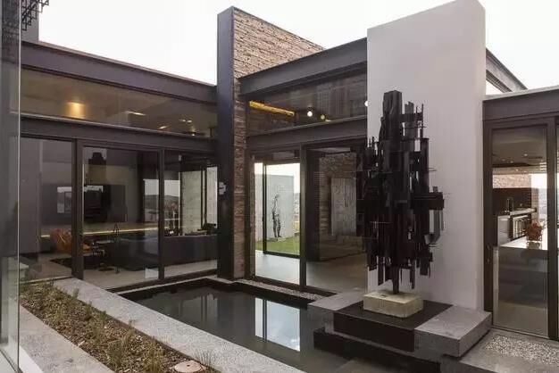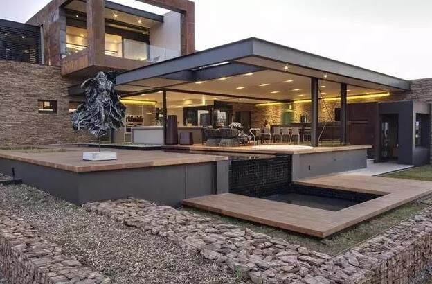 建筑師用鋼鐵,混凝土,玻璃為主要材料,結(jié)合就近取材的天然板巖和花崗巖,天然實(shí)木地板 ,打造了一個(gè)工業(yè)時(shí)代感的現(xiàn)代化豪宅,貫穿建筑的兩級(jí)錯(cuò)落水景是設(shè)計(jì)中的主要亮點(diǎn)。