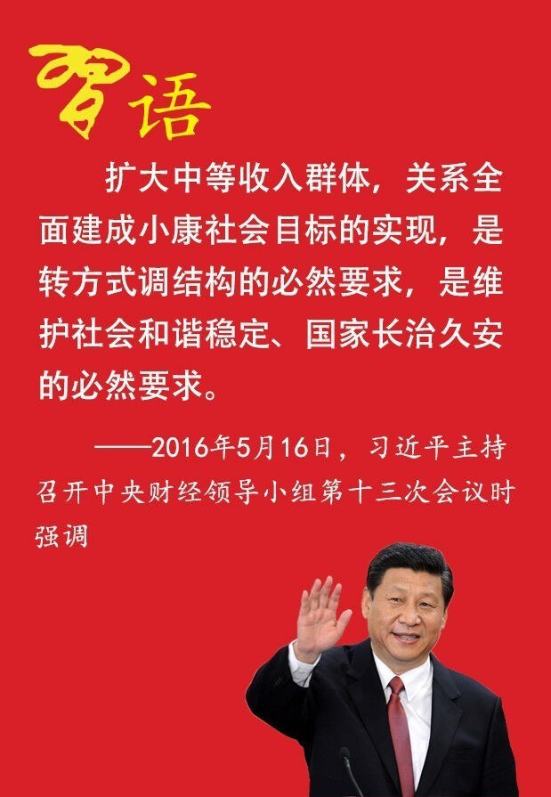 2016年5月16日,習(xí)近平主持召開中央財(cái)經(jīng)領(lǐng)導(dǎo)小組第十三次會議,分別研究落實(shí)供給側(cè)結(jié)構(gòu)性改革、擴(kuò)大中等收入群體工作。他強(qiáng)調(diào)要堅(jiān)持以人民為中心的發(fā)展思想,在全社會大力弘揚(yáng)勤勞致富、艱苦奮斗精神,激勵(lì)人們通過勞動創(chuàng)造美好生活,不斷提高生活水平。