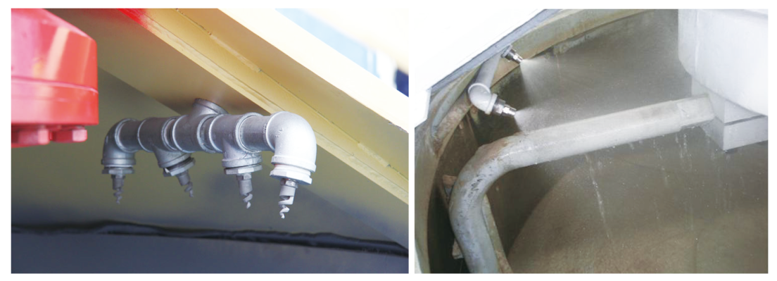 水路采用上置式結(jié)構(gòu)(專利產(chǎn)品),解決管路中殘余外加劑和水的現(xiàn)象,避免可客戶換配方時造成損失。噴頭采用螺旋形實心圓錐形噴嘴,具有細密均勻的霧化效果,覆蓋面積大,使物料攪拌均勻。