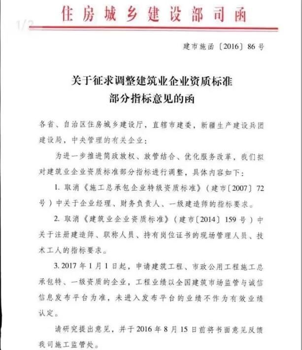 近日,住房和城鄉(xiāng)建設(shè)部建筑市場監(jiān)管司就“調(diào)整建筑業(yè)企業(yè)資質(zhì)標(biāo)準(zhǔn)部分指標(biāo)”征求意見(建市施函[2016]86號(hào)),主要內(nèi)容有以下兩點(diǎn):