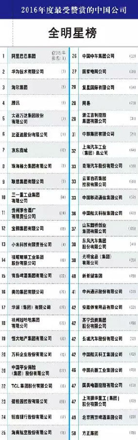 這份榜單一向被認(rèn)為是中國(guó)公司軟實(shí)力的晴雨表,今年的排行榜由《財(cái)富》(中文版)通過(guò)網(wǎng)絡(luò)向35000名中國(guó)企業(yè)管理人發(fā)放問(wèn)卷調(diào)查得出。調(diào)查評(píng)分標(biāo)準(zhǔn)主要包括產(chǎn)品和服務(wù)地位、長(zhǎng)期投資價(jià)值、公司資產(chǎn)合理利用、創(chuàng)新能力、管理質(zhì)量、財(cái)務(wù)穩(wěn)健程度、吸引和保留人才的能力、社會(huì)責(zé)任、全球化經(jīng)營(yíng)的有效性9個(gè)方面,綜合得分最高的50家公司榮登“最受贊賞的中國(guó)公司”全明星榜。