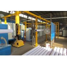布料機(jī)專利設(shè)計(jì)的膠帶機(jī)頭部清掃器是為輸送混凝土清掃砂漿的特殊要求設(shè)計(jì)的。刮刀采用硬質(zhì)合金材料,矩型段面,耐磨且不傷膠帶,砂漿損失小。上料膠帶機(jī)設(shè)計(jì)為由兩節(jié)輕型桁架的鉸接結(jié)構(gòu),上端鉸接在車架上的轉(zhuǎn)料斗上,通過(guò)鉸接油缸根據(jù)需要調(diào)整兩節(jié)桁架之間的角度;在膠帶機(jī)的下部,設(shè)計(jì)有萬(wàn)向輪,在油缸的驅(qū)動(dòng)下可沿桁架軸向移動(dòng),可調(diào)整膠帶尾部的高度。