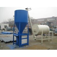 過傳感器的數(shù)據(jù)反饋,實(shí)現(xiàn)原料計(jì)量。計(jì)量好后的物料,通過螺旋輸送機(jī)導(dǎo)進(jìn)主斗提機(jī),提升到混合機(jī)上部待混料倉(cāng)中。待混倉(cāng)為氣動(dòng)大開門型,可以迅速將待混物料放入無重力