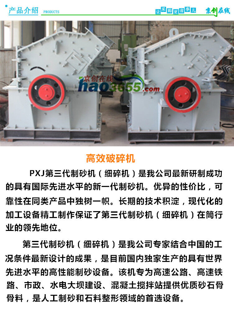 PXJ第三代制砂機(jī)(細(xì)碎機(jī))800×800也稱第三代制砂機(jī)。該系列細(xì)碎機(jī)運(yùn)行性能穩(wěn)定可靠,工藝簡(jiǎn)化,結(jié)構(gòu)簡(jiǎn)單,維修方便。生產(chǎn)能力大,錘頭使用壽命長(zhǎng)。廣泛適用于花崗巖、玄武巖、石灰?guī)r、河卵石、水泥熟料、石英石、鐵礦石、鋁礬土等多種礦物的細(xì)式破碎。同時(shí)也是用于機(jī)制人工制砂、高等級(jí)公路、鐵路、水利、機(jī)場(chǎng)、建筑、水泥、耐材、冶金等行業(yè)生產(chǎn)優(yōu)質(zhì)石料。