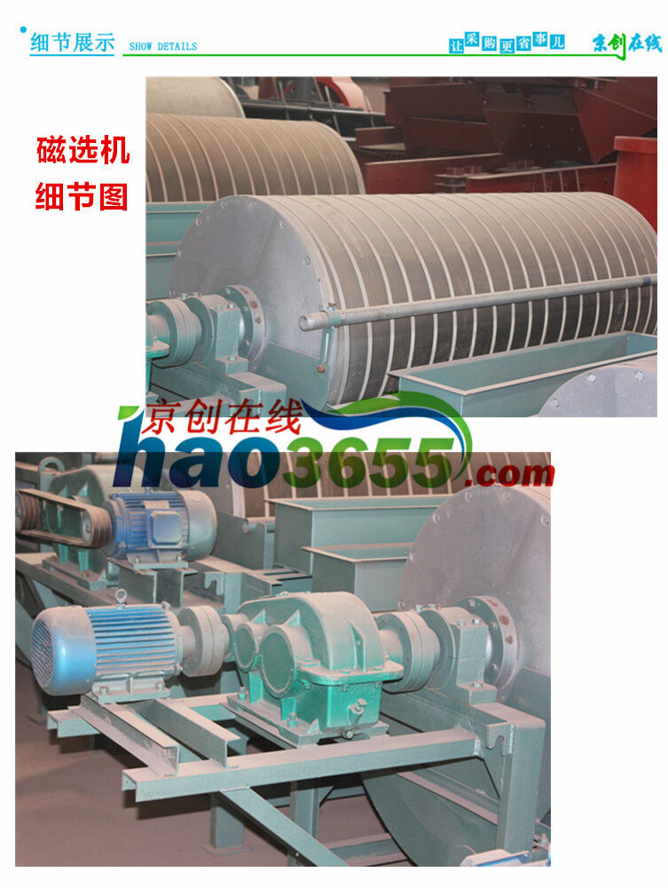 濕式永磁筒式磁選機(jī)主要由圓筒、磁系、槽體、傳動部分四部分組成。圓筒由2-3mm不銹鋼板卷焊成筒,端蓋為鑄鋁件,用不銹鋼螺釘和筒相連。電機(jī)通過減速機(jī),帶動圓筒作回轉(zhuǎn)運(yùn)動。磁系為開放式磁系,裝在圓筒內(nèi)。磁塊用不銹鋼螺栓裝在磁軛的底板上,磁軛的軸伸出筒外,軸端固定有拐臂。扳動拐臂可以調(diào)整磁系偏角,調(diào)整合適后可以用拉桿固定。槽體的工作區(qū)域用不銹鋼板制造,機(jī)架和槽體的其他部分用普通鋼材焊接。