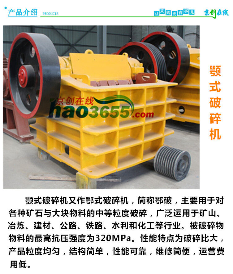 顎式破碎機(jī)在礦山、建材、基建等部門主要用作粗碎機(jī)和中碎機(jī)。按照進(jìn)料口寬度大小來分為大、中、小型三種,進(jìn)料口寬度大于600MM的為大型機(jī)器,進(jìn)料口寬度在300-600MM的為中型機(jī),進(jìn)料口寬度小于300MM的為小型機(jī)。顎式破碎機(jī)結(jié)構(gòu)簡單,制造容易,工作可靠,使用維修方便。