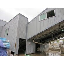 1)料廠封裝:立柱采用450*5角鋼,立柱角鋼間的橫向聯(lián)系及斜撐采用∠30角鋼;拱架采用Φ48*2mm鍍鋅鋼管,斜撐及聯(lián)系采用Φ21*1.5mm鍍鋅鋼管及∠30角鋼。屋面檁條采用12#鍍鋅C型鋼。屋面彩鋼棚采用0.3mm厚藍(lán)色彩鋼板,頂棚排水采用630*1.2mm鍍鋅檐溝。圍擋檁條采用12#鍍鋅C型鋼,斜撐采用Φ16mm的圓鋼拉筋,彩鋼棚采用0.3mm厚藍(lán)色彩鋼板。