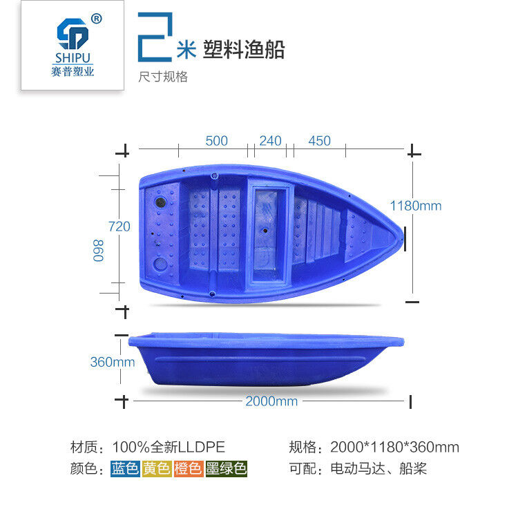 1.塑料漁船船體可裝電動(dòng)馬達(dá),可以配船槳,可配頂棚改裝為景觀船。