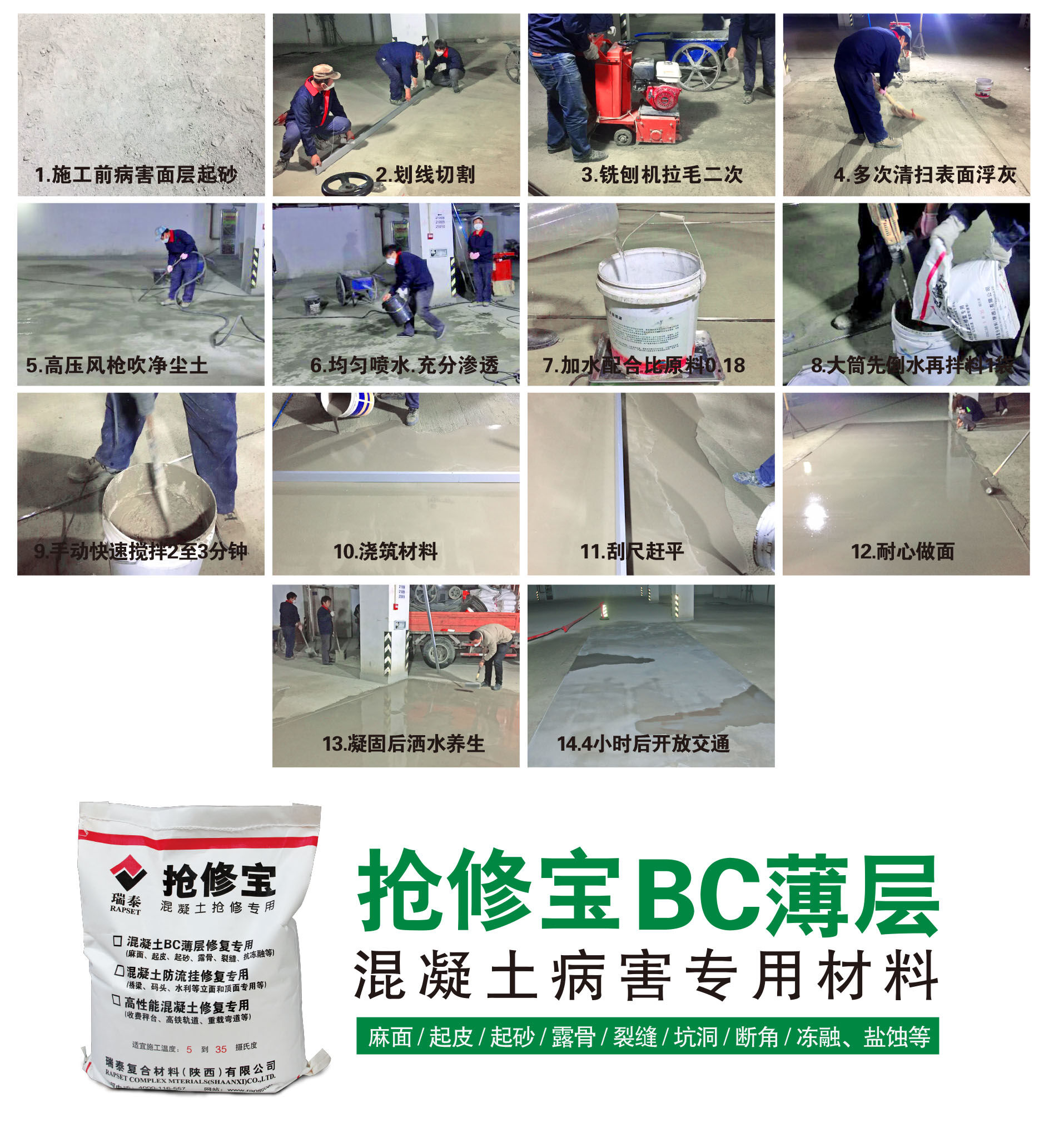 搶修寶混凝土路面修補料是由特種水泥、硅酸鹽水泥、高分子聚合物、功能性添加劑、早強纖維及精選骨料組成,為高分子改性水泥基復(fù)合材料,既有水泥基材料的耐久性,又有聚合物材料良好的內(nèi)聚力和柔韌性,并具有補償收縮的特性。其主要特點是15分鐘凝固,1小時抗壓強度達到30Mpa,達到快速通車的要求,且后期強度不倒縮!