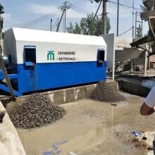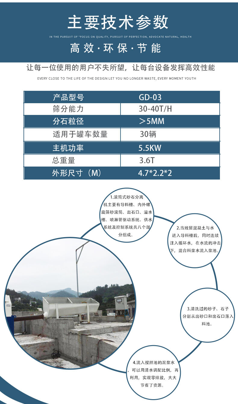 滾筒式砂石分離機(jī)主要有導(dǎo)料流槽、內(nèi)外螺旋篩砂滾筒、出石口、溢水槽、噴淋管、驅(qū)動系統(tǒng)、供水系統(tǒng)及控制系統(tǒng)共八個部分組成。當(dāng)殘留混凝土與水進(jìn)入導(dǎo)料槽后,同時連續(xù)注入循環(huán)水,在水流的沖擊下,混合料漿水流入漿池。清洗過的砂子、石子分別從出砂口和出石口落入料池。流入攪拌池