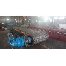 重型板式給料機是由電動機轉動,再經過聯軸器、減速器等帶動主軸旋轉,并通過主軸裝置上的鏈輪與鏈條嚙合帶動鏈條上的鏈板運動,達到運送物料的目的,鏈板間隙可除去原料中的細粒泥土。在驅動裝置的減速器上常裝有逆止器(安裝傾角大于15°時),以防止停機時發(fā)生倒轉,并可通過變頻裝置調節(jié)給料速度。重型板式給料機是礦石輸送系統(tǒng)的重要設備,常用在原料倉底,可連續(xù)、均勻的向初級破碎機給料,能在露天、潮濕等惡劣環(huán)境下可靠地工作,該機已在大型選礦廠破碎車間及水泥企業(yè)等廣泛使用。