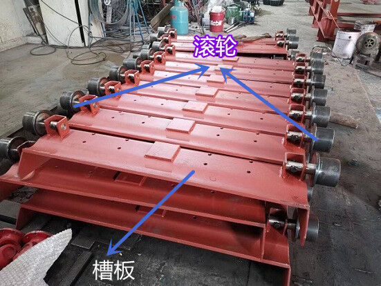 承載構件——滾輪采用了滾動軸承結構,有利于減小運行阻力,減少動力消耗。該結構型式便于維護。滾輪由支承座和槽板固定,滾輪在軌道上滾動,帶動槽板和槽板上的物料運動。