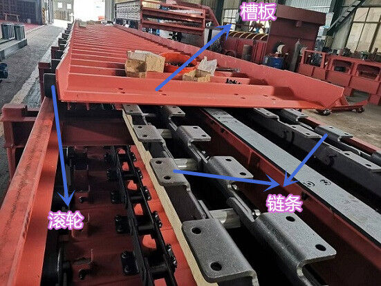 板式給料機運行部件由牽引鏈條,承載構件行走滾輪和輸送槽板等組成。