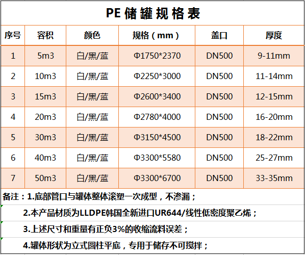 所用材質為韓國進口聚乙烯(PE)滾塑原料,儲罐一次成型,內(nèi)外光滑,具有良好的衛(wèi)生性與抗紫外線能力,耐酸堿、耐腐蝕、易清洗、不易老化。它可以盛裝在常溫下無機酸、堿、鹽等大部分物質及有機物,耐熱耐凍 耐熱耐凍性佳,-5℃—+85℃均可使用